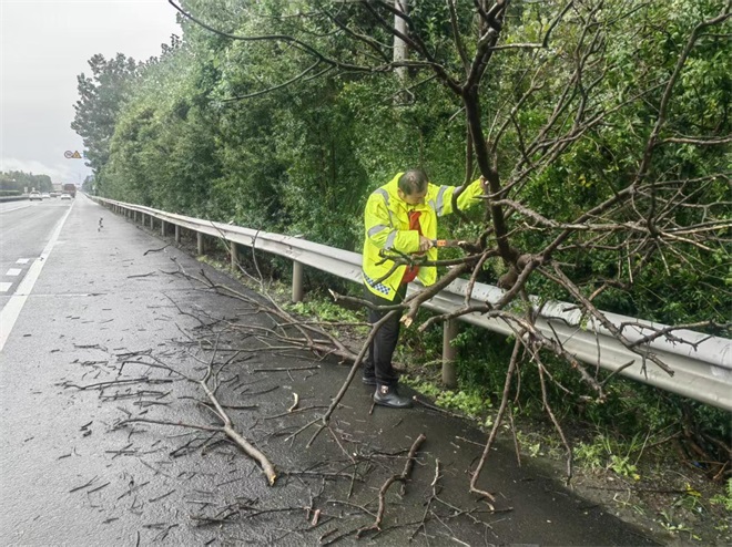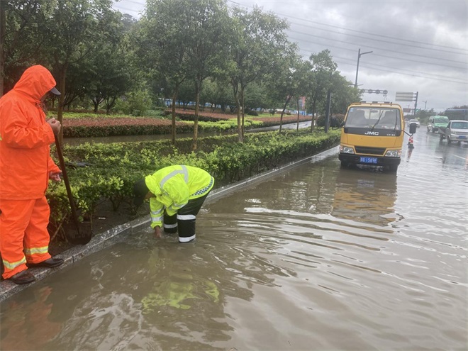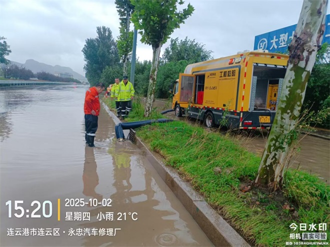 10月2日,大雨突降,公司迅速啟動防汛應(yīng)急預(yù)案,嚴(yán)格落實防汛措施,不分晝夜,連續(xù)對所轄高速公路、國省干線等重點路段及沿線設(shè)施開展隱患排查,確保道路安全暢通。針對G310港城大道、G228新光路等路段積水較多、路邊樹木倒伏等嚴(yán)重情況,公司立即組織橙色突擊隊員、道路養(yǎng)護(hù)人員及時清理疏通倒伏樹木、排水溝、雨水井,全力保障排水系統(tǒng)暢通與道路安全,累計出動道路養(yǎng)護(hù)人員 90人次、巡查車輛 12臺次,調(diào)配各類機(jī)械設(shè)備 14 臺次,清理倒伏樹木20余株。連云港綜合客運樞紐出站口突發(fā)雨水倒灌,公司立即組織應(yīng)急人員協(xié)助連云港站前廣場管理服務(wù)聯(lián)盟調(diào)動水泵排水并引導(dǎo)旅客安全出行。經(jīng)50分鐘緊急處置,積水全部排除,道路恢復(fù)暢通。